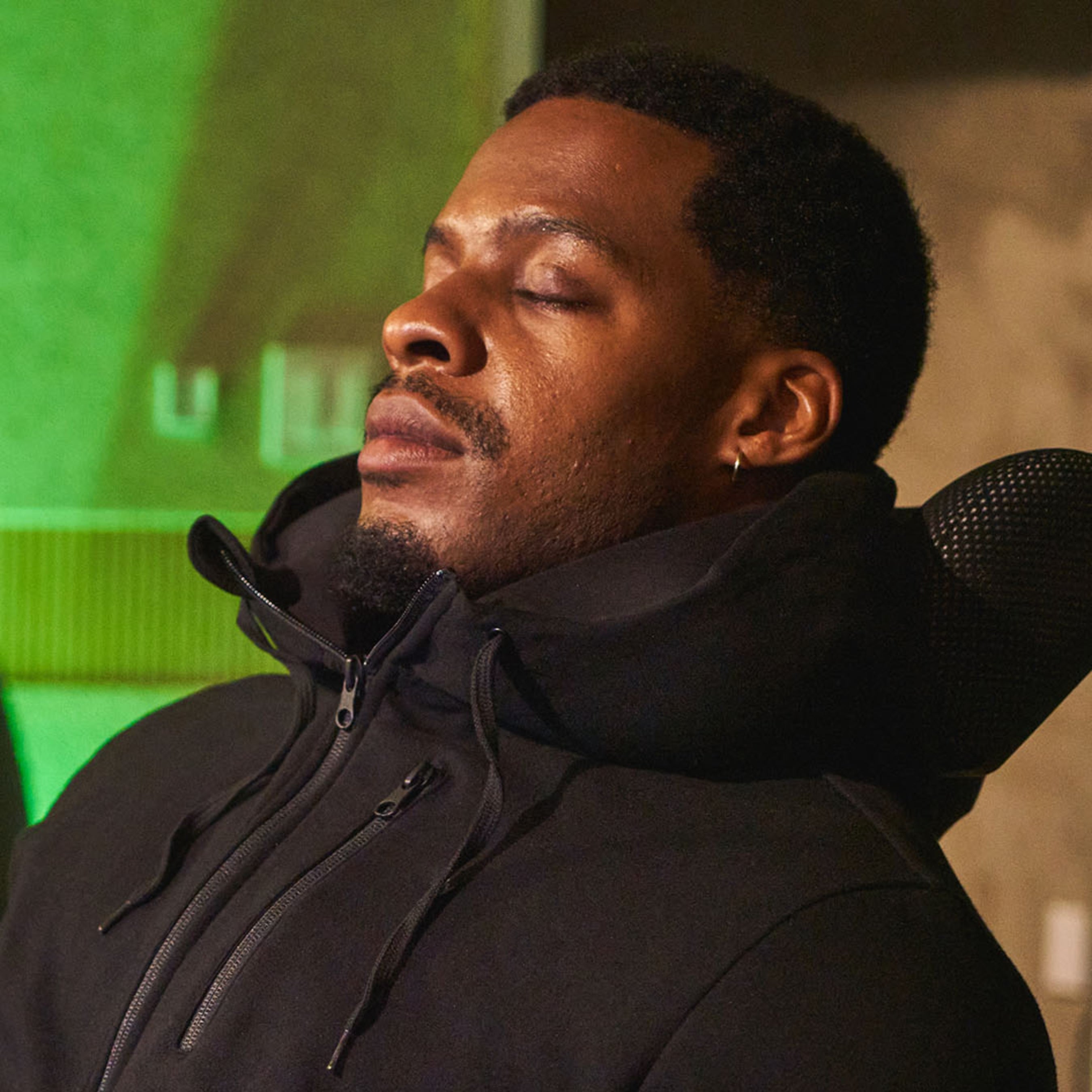 The hoodie uses CVSM Airtech Technology, allowing the hood to inflate in just 3 seconds through a discreet valve, instantly becoming a supportive neck pillow.