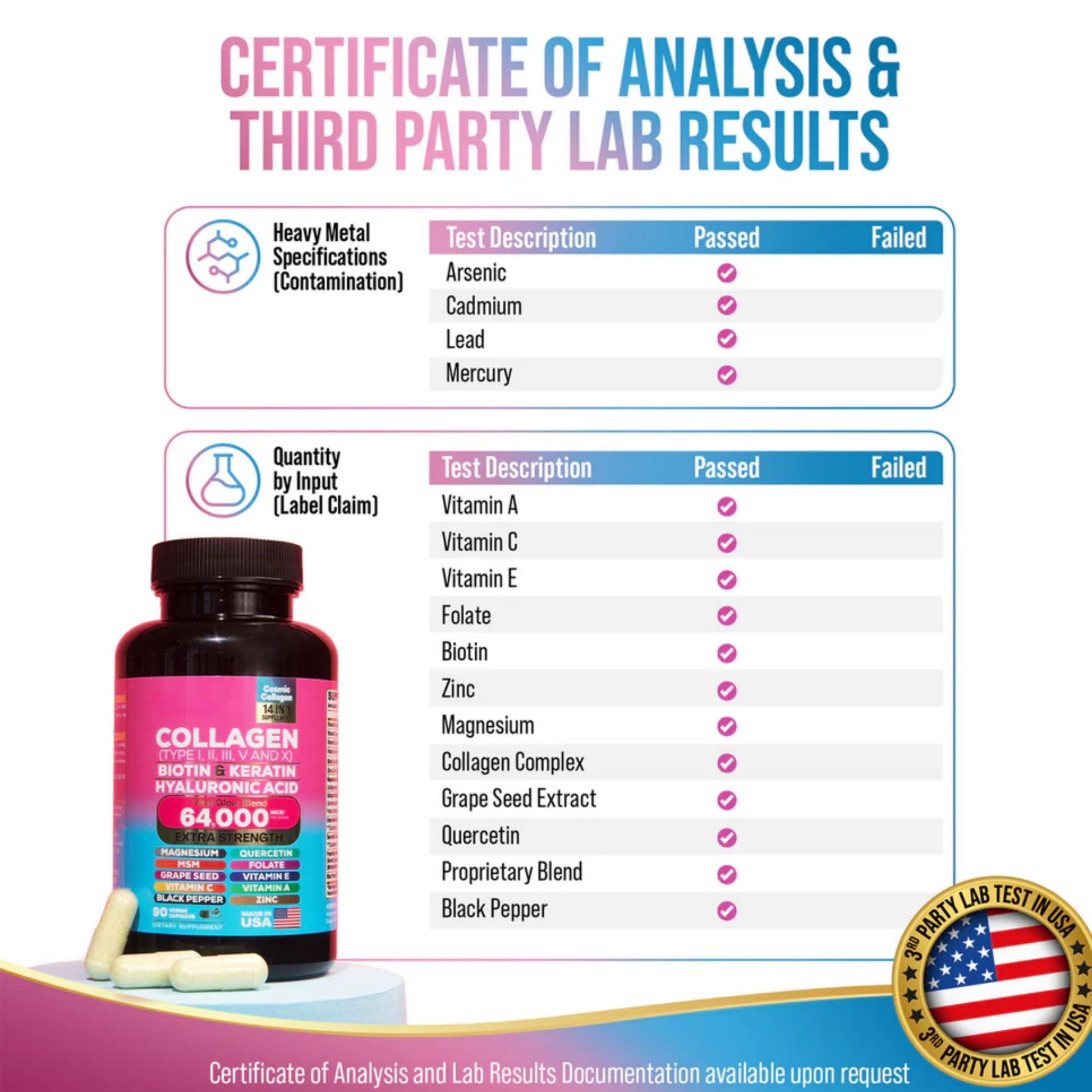 Unlike many beauty supplements on the market, our formula is rigorously third party lab tested in the United States so you know exactly what you’re putting in your body. Every batch is screened for purity, potency, and safety, with zero contaminants, heavy metals, or hidden fillers.