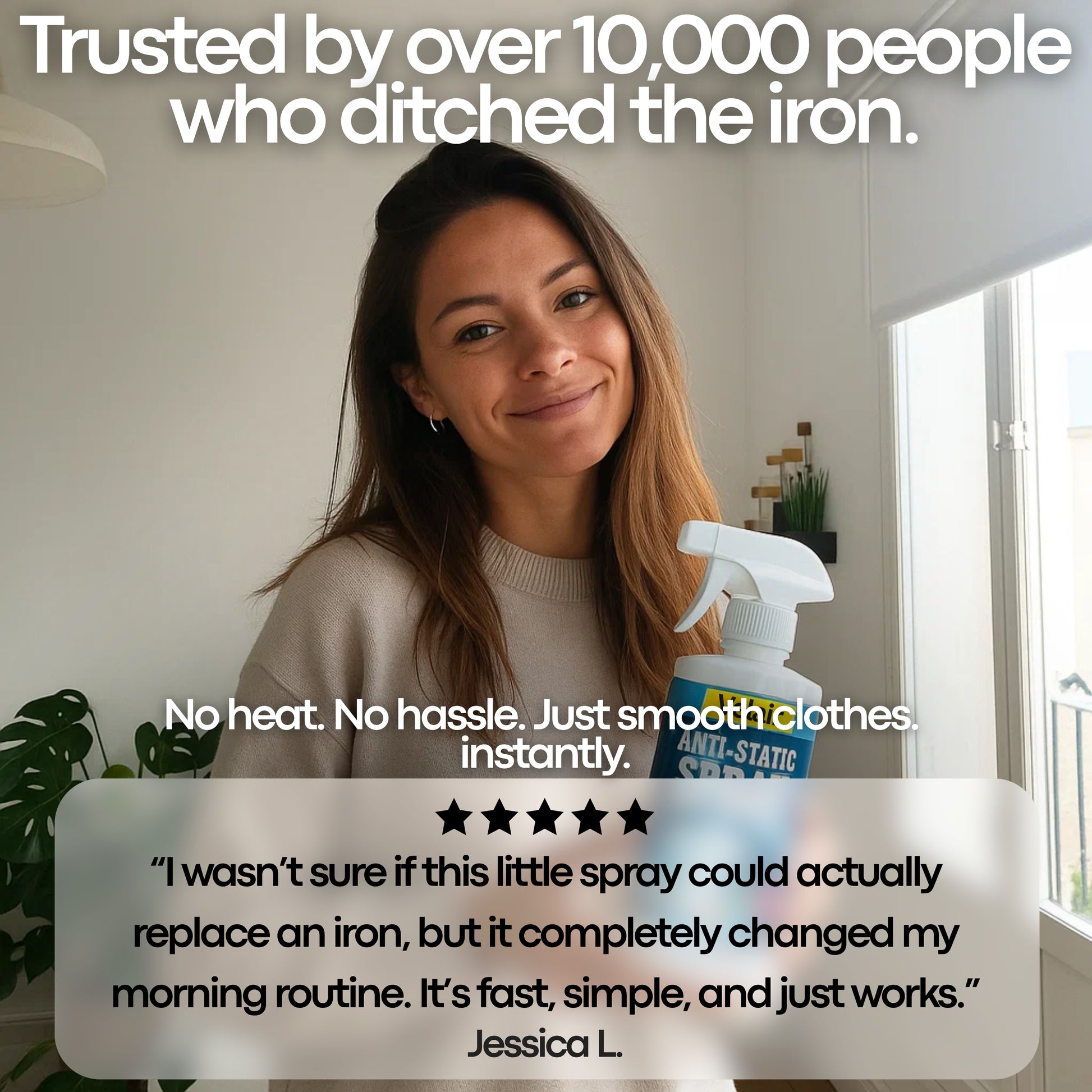 "I used to rush out the door with creased shirts and clingy sleeves. Now I spray this and my outfit looks smooth and fresh in seconds."